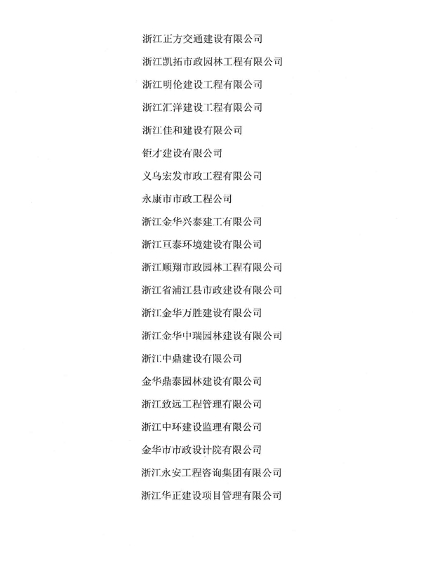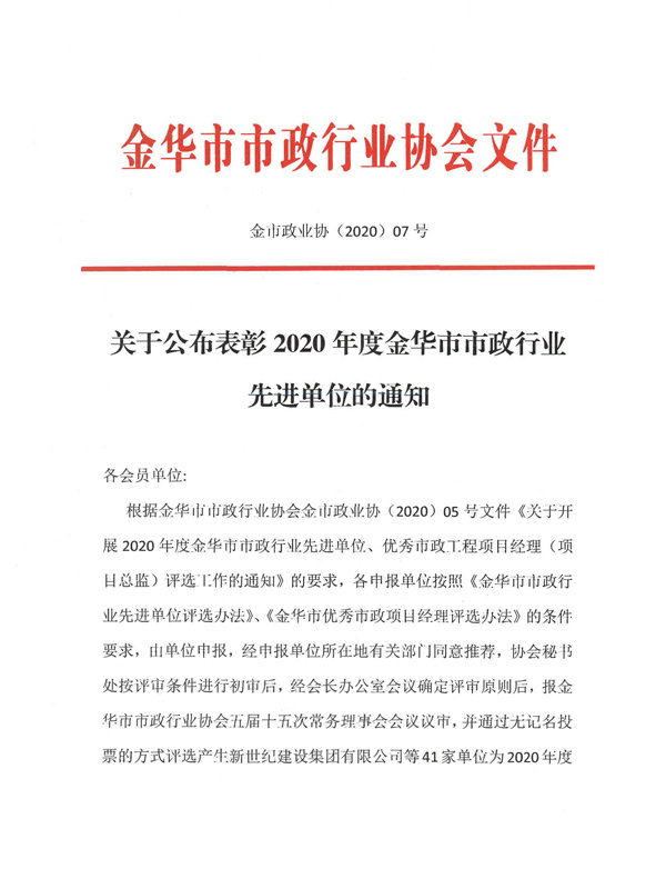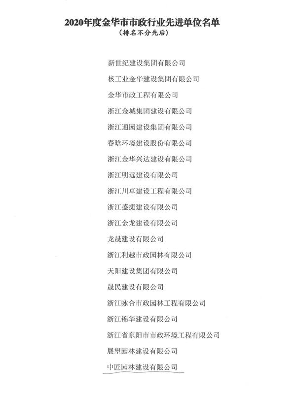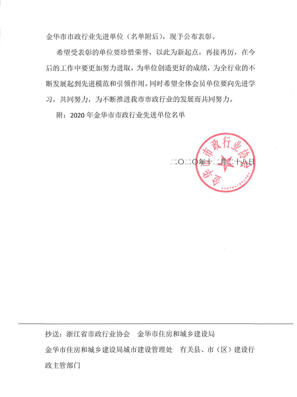 2020年金華市市政行業先進單位
